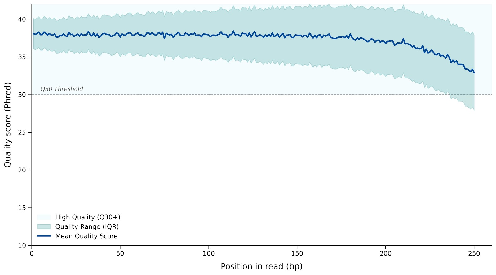 Basisqualitätsverteilung für Antikörper VH/VL-Sequenzierungslesungen. Konsistent hohe Phred-Werte über die Leselänge hinweg deuten auf eine saubere Amplifikation und eine hochgradig vertrauenswürdige Sequenzrekonstruktion hin.