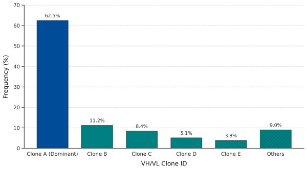Klonfrequenzverteilung von VH/VL-Varianten, die durch NGS nachgewiesen wurden. Der dominante Klon repräsentiert die funktionale Antikörpersequenz, während niedrigfrequente Varianten die Heterogenität der Hybridome oder falsch gepaarte Ketten aufzeigen.