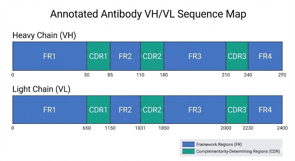 Annotierte VH- und VL-Sequenzen, die die Rahmenregionen (FR) und die komplementaritätsbestimmenden Regionen (CDRs) zeigen. Diese Karte bietet eine visuelle Zusammenfassung der Antikörperbindungsregionen und ist entscheidend für das Engineering und die rekombinante Expression.