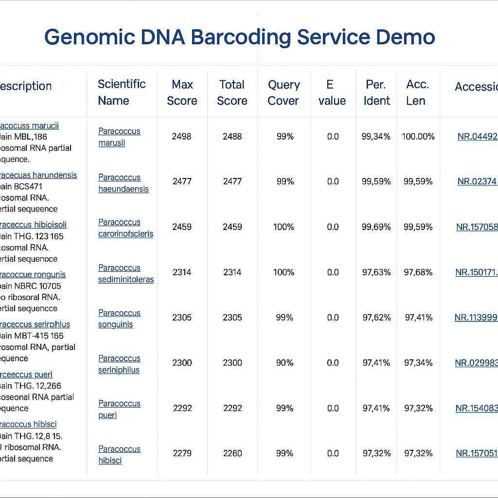 Der letzte Schritt besteht darin, die erhaltene Sequenz mit Referenzdatenbanken zu vergleichen, wie zum Beispiel GenBank, um die Art zu identifizieren. Wir stellen einen detaillierten Bericht zur Verfügung, der Ihre Sequenzdaten und die besten Übereinstimmungen aus der Datenbank enthält.