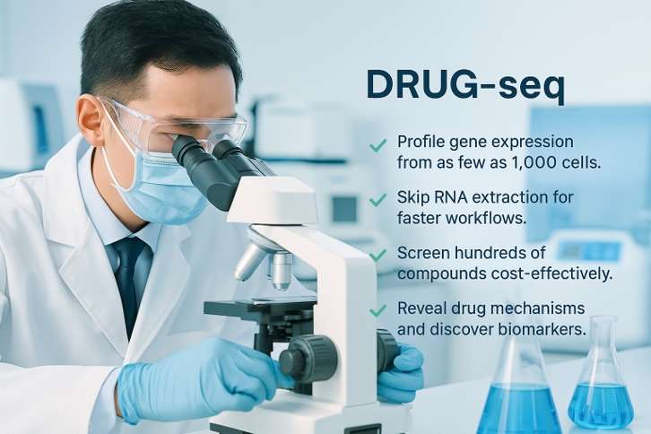 DRUG-seq, oder digitale RNA-Störung von Genen-Sequenzierung, ist eine hochmoderne RNA-Sequenzierungstechnologie, die hochdurchsatzfähige Arzneimittel-Screenings und eingehende Studien zu Wirkmechanismen ermöglicht. Im Gegensatz zu traditionellen RNA-seq-Methoden, die große Mengen an Ausgangsmaterial und komplexe RNA-Extraktionsschritte erfordern, liefert DRUG-seq umfassende Transkriptom-Profilierungen direkt aus Zelllysaten, Organoiden oder Gewebeschnitten – selbst wenn die Probenmengen extrem begrenzt sind.