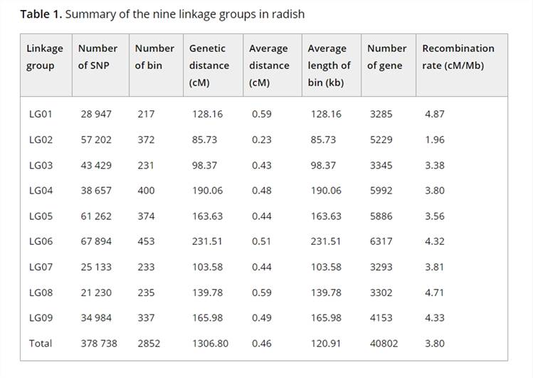Um eine hochauflösende genetische Verknüpfungskarte im Rettich zu erstellen, wurde eine Ganzgenom-Nachsequenzierung von 137 F2-Individuen und ihren Elternlinien unter Verwendung der Illumina HiSeqTM 2500-Plattform durchgeführt. Dies ergab 403 Gb saubere Reads, die auf das Rettich-Referenzgenom abgebildet wurden, und identifizierte nach der Filterung 411.891 SNPs. Mit einem Sliding-Window-Ansatz wurden 2.852 Rekombinations-Bin-Marker erstellt, die eine genetische Distanz von 1.306,8 cM abdeckten, mit einem durchschnittlichen Abstand von 0,46 cM zwischen den Markern. In einigen Markern wurde eine signifikante Segregationsverzerrung beobachtet, die 19 Segregationsverzerrungsregionen über sieben Verknüpfungsgruppen identifizierte. Verzerrte Marker wurden beibehalten, um die Abdeckung der Verknüpfungsgruppen zu verbessern.