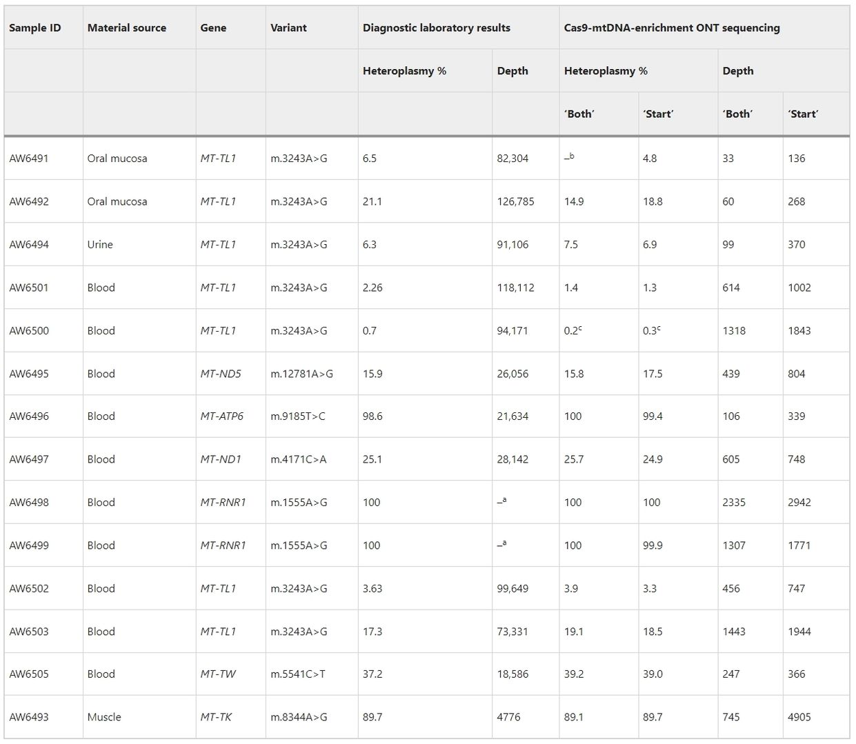 Die Cas9-mtDNA-Anreicherungsanalyse erkennt genau Heteroplasmie in pathogenen SNVs über 14 klinische Proben. Die Methode, ohne Exonuklease-V-Behandlung, erreicht eine variable mtDNA-Genomabdeckung (×33 bis ×2335), die mit den DNA-Abbaustufen der Proben korreliert. Die Einbeziehung sowohl vollständiger Reads als auch Reads, die an spezifischen Cas9-Schnittstellen-Barcodes beginnen, erhöht die Abdeckung und das Vertrauen in die Variantenbestimmung. Alle berichteten Heteroplasmien sind bestätigt, mit Frequenzen von <0,2 % bis 100 %, und es wurden keine großen Deletionen beobachtet. Darüber hinaus werden nicht-pathogene polymorphe Stellen und Varianten unbekannter Bedeutung identifiziert, was die Bedeutung der Bewertung der Variantenfrequenz innerhalb der allgemeinen Bevölkerung und spezifischer Haplogruppen unterstreicht.