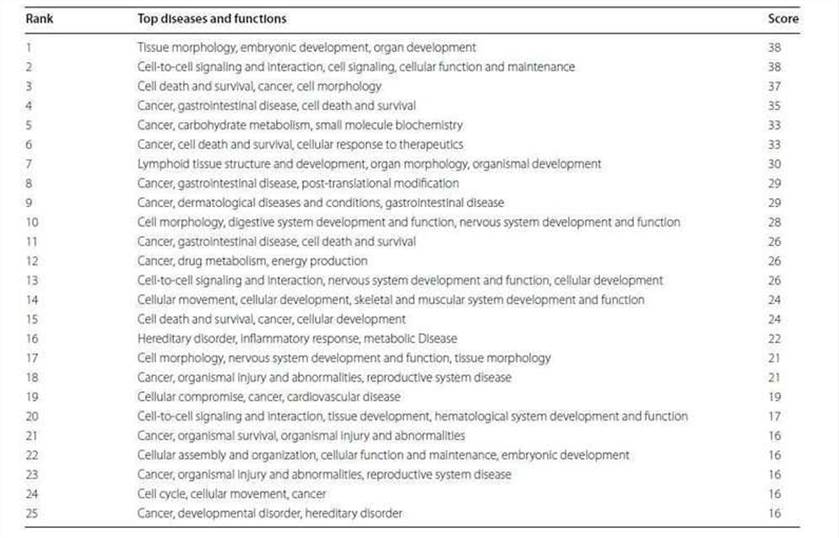 Die 2147 Gene mit signifikanten Veränderungen in der Methylierung wurden analysiert. Die krebsbezogenen Netzwerke machten den Großteil aus (Tabelle 2), was darauf hindeutet, dass der Unterschied zwischen TRAMP und der Kontrolle in der Organentwicklung und der Krebsentwicklung lag. Die am häufigsten assoziierten Krankheiten, Krebs, gastrointestinale Erkrankungen, Organismusanomalien, Erkrankungen des Fortpflanzungssystems und dermatologische Erkrankungen, belegten die ersten fünf Plätze (Abbildung 3).