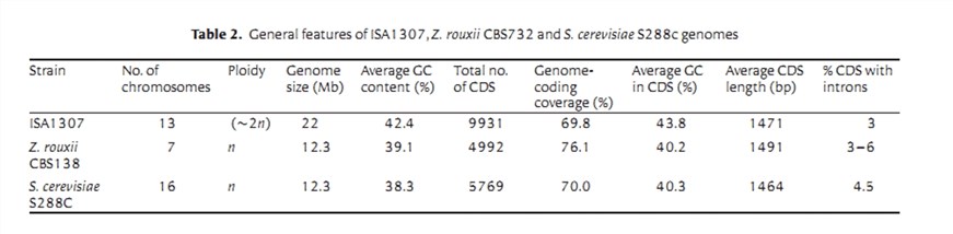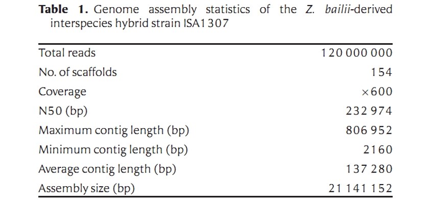 Diese Arbeit beschrieb die Genomsequenzierung und Annotation des Hefestamms ISA1307, der aus einem Sektproduktionsbetrieb isoliert wurde. Dieser Stamm, der früher als der Zygosaccharomyces bailii Art, ist ein interspezifischer Hybrid zwischen Z. bailii und eine eng verwandte Art.