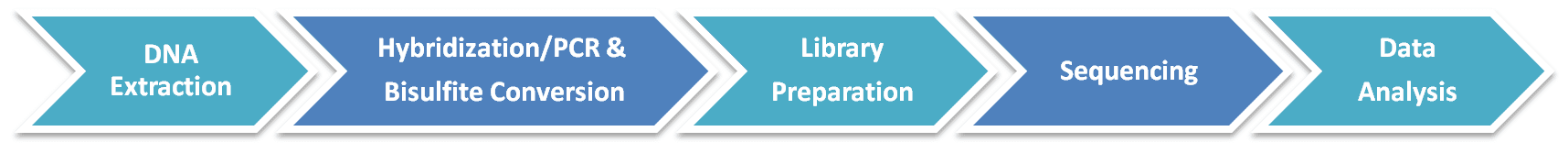 Der Arbeitsablauf der PCR-basierten gezielten Bisulfit-Sequenzierung ist in Abbildung 1 dargestellt. Bei der hybridisierungsbasierten gezielten Bisulfit-Sequenzierung kann entweder die Bisulfit-Konversion von hybrid-selektiertem nativen DNA oder die Hybridselektion von konvertierter DNA durchgeführt werden. Letzterer Ansatz ist mittlerweile kommerziell verfügbar und zeichnet sich durch eine überlegene Zielgenauigkeit, geringere DNA-Eingangsvoraussetzungen und die Fähigkeit aus, eine C-zu-U-Bisulfit-Konversion von einem C-zu-T-SNP zu unterscheiden.