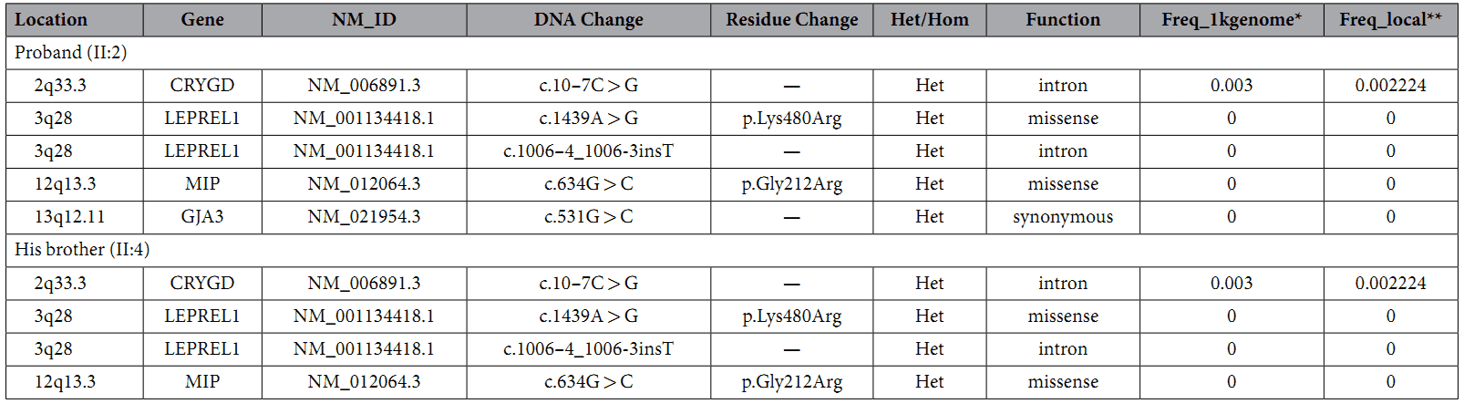 Ein maßgeschneidertes Fangpanel wurde entwickelt, um 351 Gene für genetische Augenerkrankungen zu erfassen, die aus OMIM (Human Genetics Knowledge for the World) und der veröffentlichten Literatur gesammelt wurden. Die Autoren fanden vier seltene Varianten in beiden Proben (Tabelle 1).