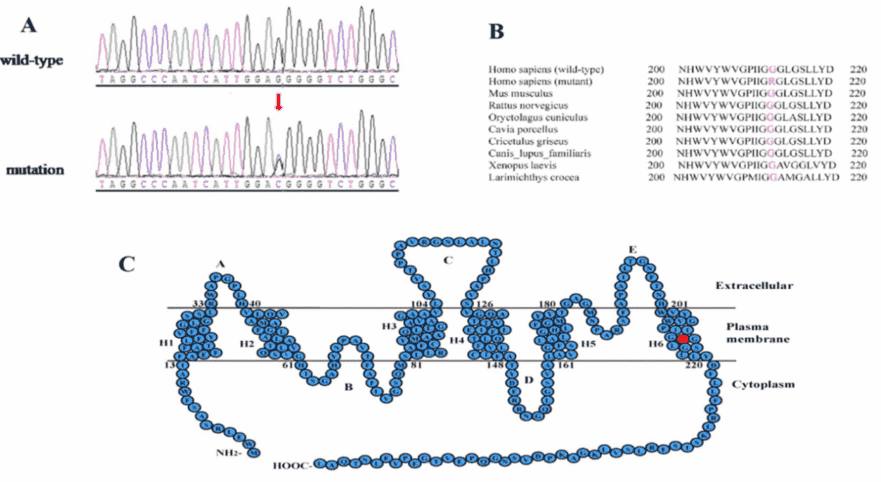 Nur die c.634G>C-Mutation des MIP Das Gen war eine neuartige heterozygote Missense-Mutation, die Glycin an Position 212 in Arginin (p.G212R) umwandelte. Die Segregationsanalyse zeigte, dass die Mutation gut mit allen betroffenen Teilnehmern cosegregierte und bei nicht betroffenen Mitgliedern oder den 100 normalen Kontrollen nicht nachgewiesen wurde.