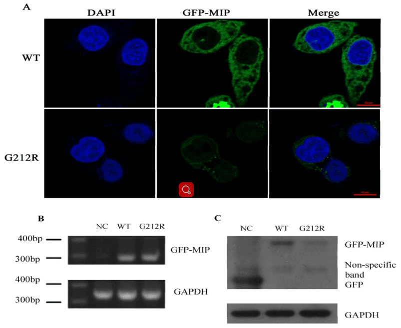 Die Autoren untersuchten die Expression des Wildtyps. MIP und G212R-MIP in transfizierten Hela-Zellen. Es zeigte sich, dass die grüne Fluoreszenz in Hela-Zellen, die mit dem G212R-Konstrukt transfiziert wurden, viel schwächer war als die in Zellen, die mit dem Wildtyp-Konstrukt transfiziert wurden.